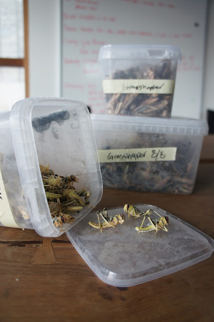The Happy Bug Man paid us a visit this week and brought along lots of grasshoppers. We froze the grasshoppers and then I was put in charge of prying the grass from the grasp of the poor frozen bugs and separate them from their poo.